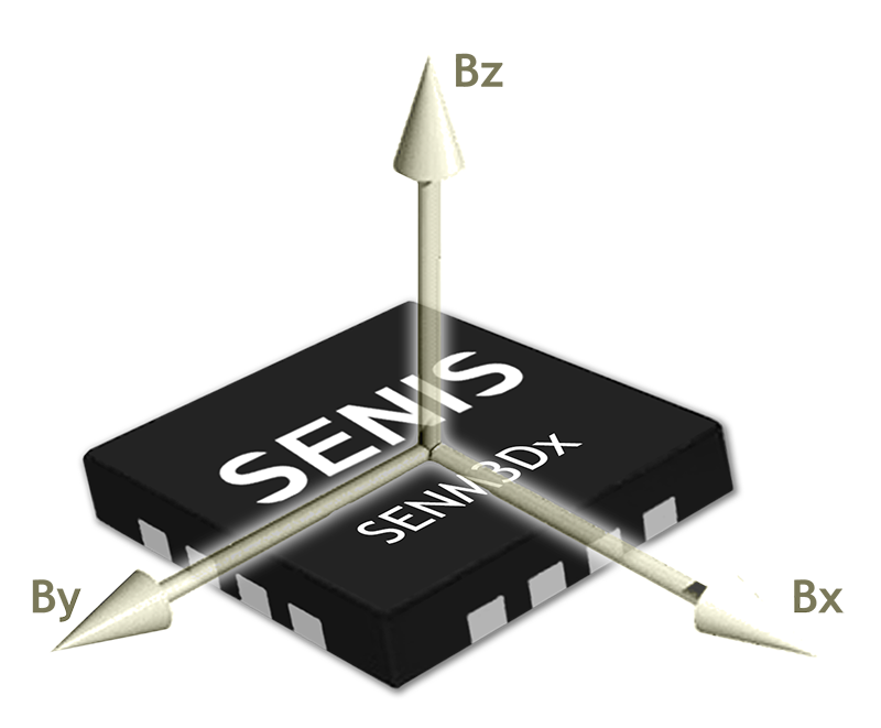 SENIS® 3DHALL Magnetic Sensor. The SENM3Dx is a CMOS magnetic field sensor that simultaneously measures three magnetic field components (Bx, By and Bz) at the same location. Contains three sets of mutually orthogonal Hall effect elements (one horizontal and two vertical), each set of elements contains a bias circuit and an amplifier.